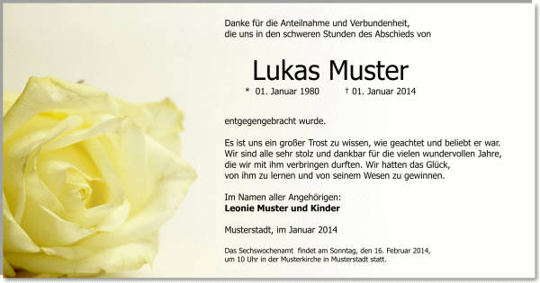 Dankbar schauen wir auf die vergangenen Jahre zurück, die von Liebe, Zuneigung und Harmonie geprägt waren. In unseren Herzen lebst Du weiter. Tiefbewegt von der großen Anteilnahme beim schmerzlichen Abschied von unserer lieben Mutter, Schwiegermutter und herzensguten Oma und Uroma Maria Mustermann geb. Muster möchten wir uns bei allen recht herzlich bedanken. Wohltuend waren die gesprochenen und geschriebenen Worte des Gedenkens und des Trostes.