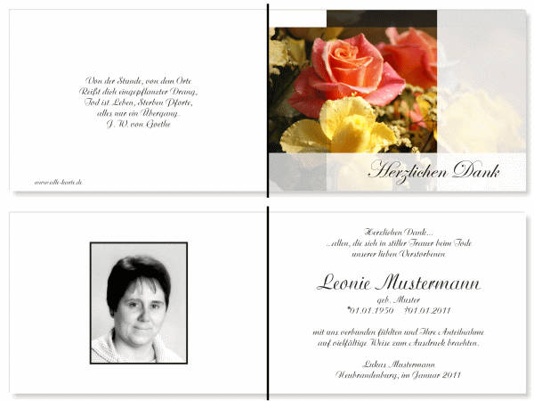 Dankbar schauen wir auf die vergangenen Jahre zurück, die von Liebe, Zuneigung und Harmonie geprägt waren. In unseren Herzen lebst Du weiter. Tiefbewegt von der großen Anteilnahme beim schmerzlichen Abschied von unserer lieben Mutter, Schwiegermutter und herzensguten Oma und Uroma Maria Mustermann geb. Muster möchten wir uns bei allen recht herzlich bedanken. Wohltuend waren die gesprochenen und geschriebenen Worte des Gedenkens und des Trostes.
